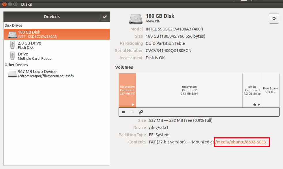 Verify that the swap space is on the SSD too. In this example, it gets partition name sdb2.